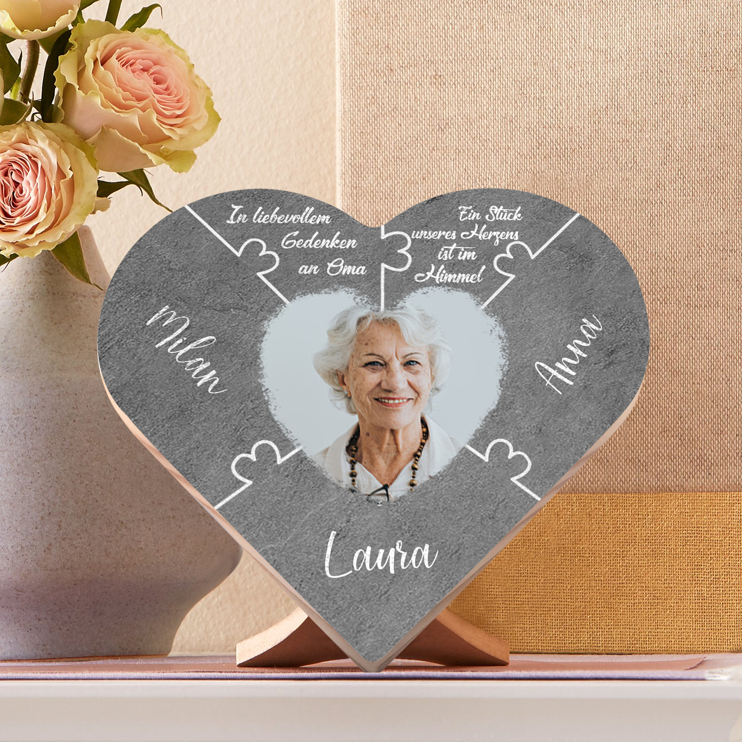 Personalisiertes Foto & 3 Namen Trauer Herzholz-Deko-In liebevollem Gedenken an Oma-Schreibtischdekoration Holz Ornament