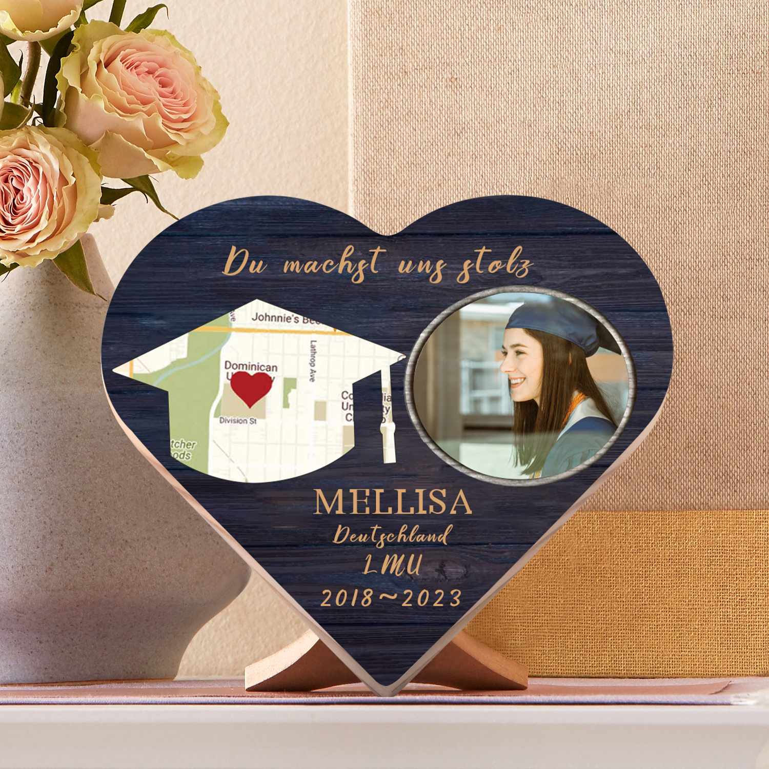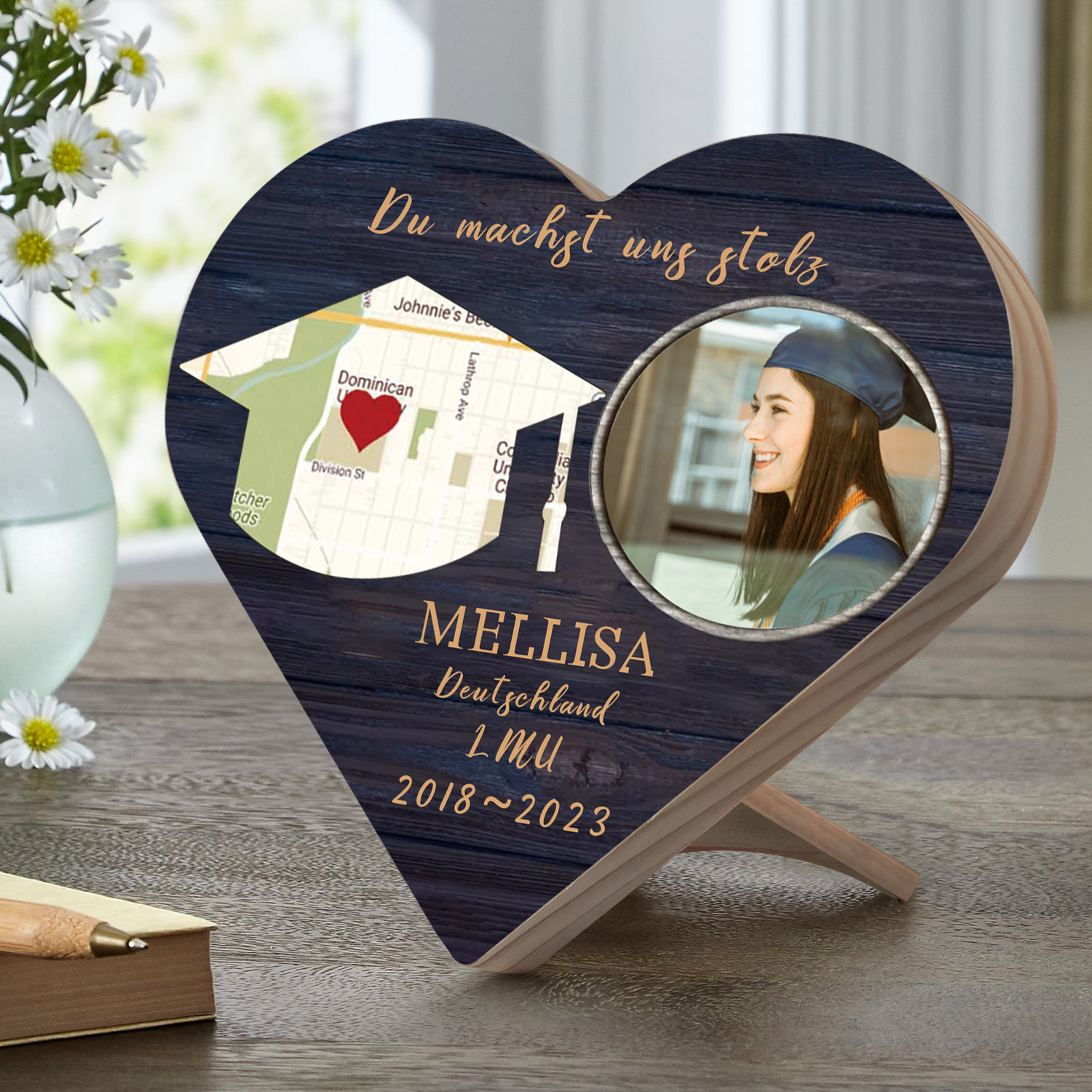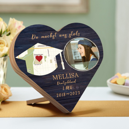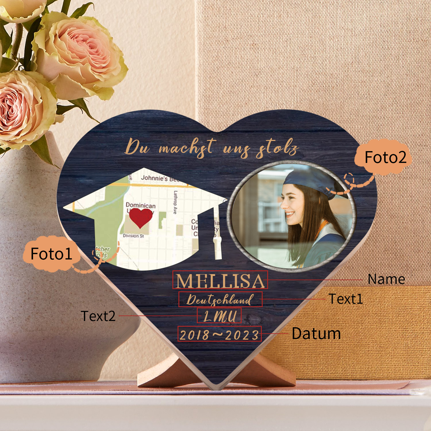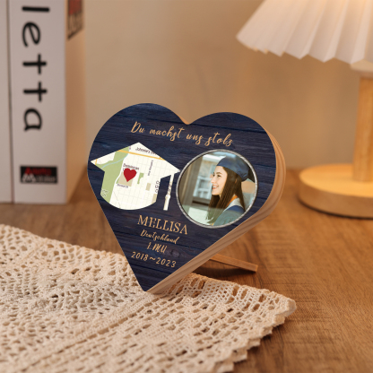 Personalisiertes Name & 2 Texte & Datum & 2 Fotos Abitur Herzholz-Deko-Abschluss Geschenk