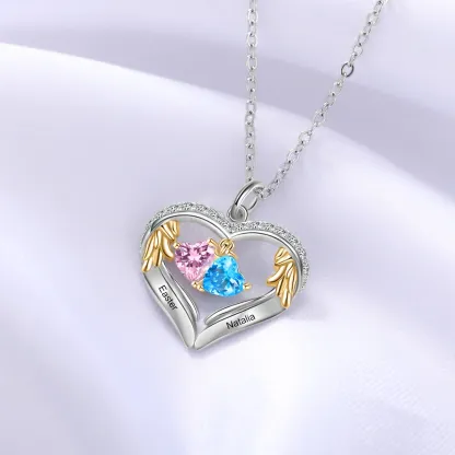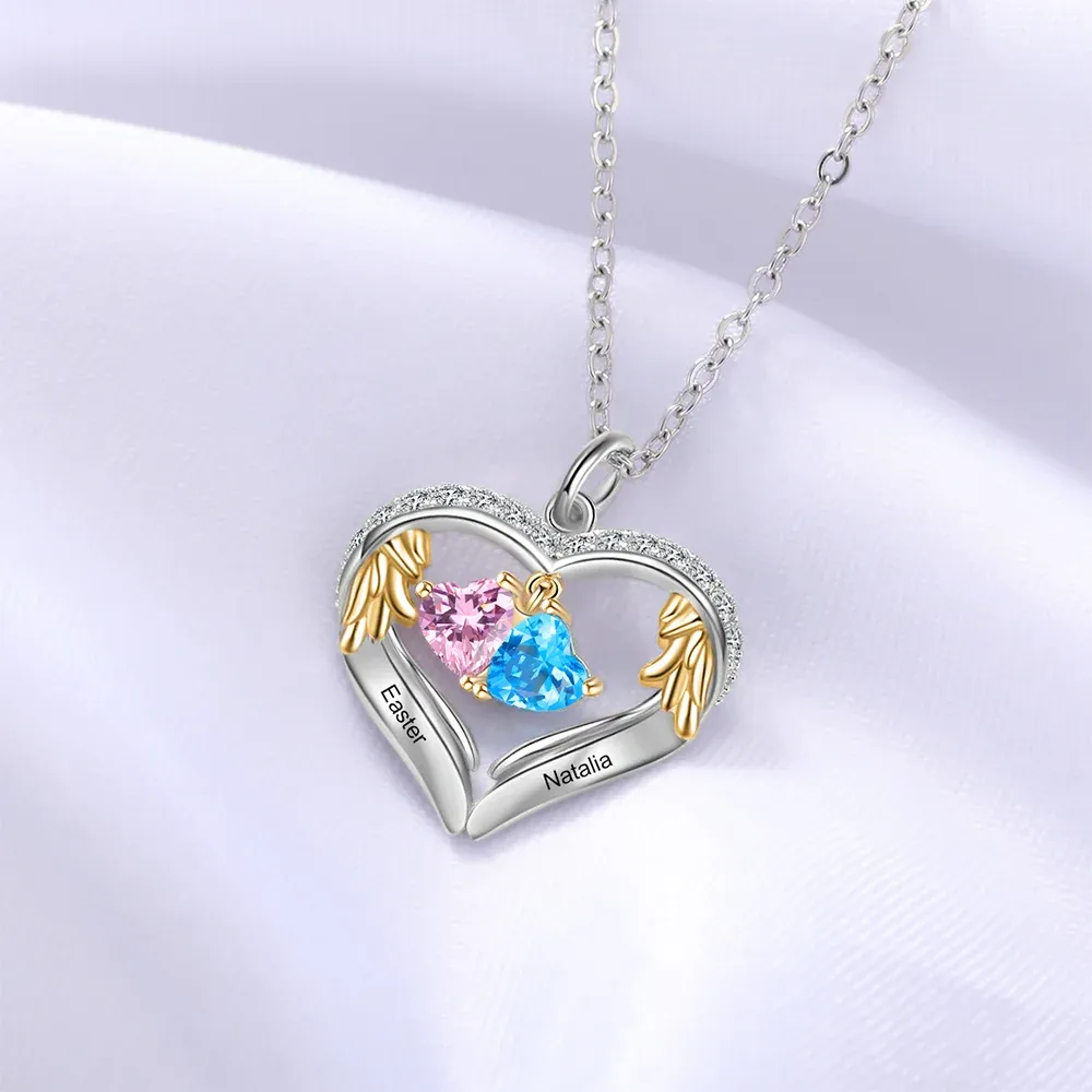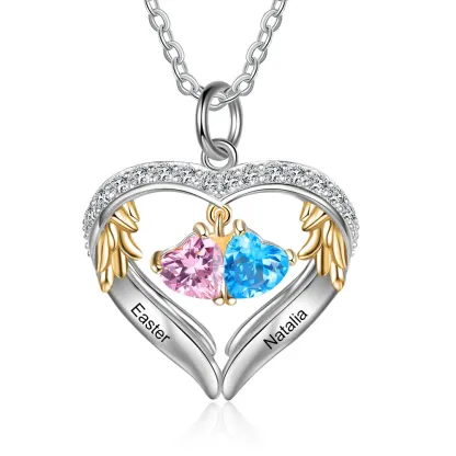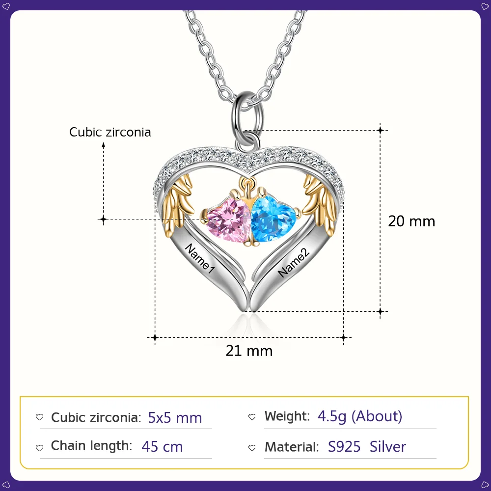 S925 Silber Gravur 2 Namen Herz Engel Flügel Halskette mit 2 Geburtssteinen