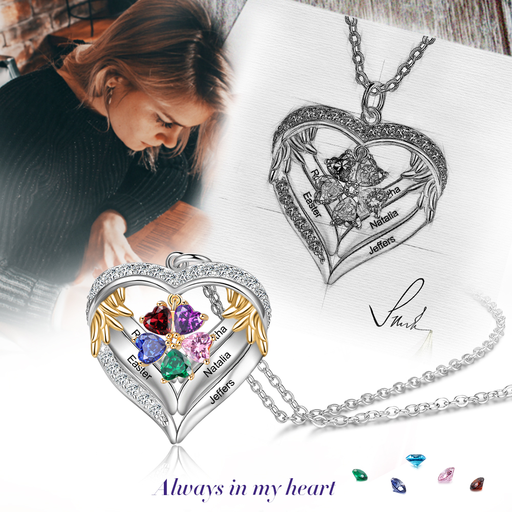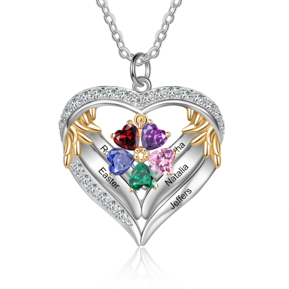S925 Silber Gravur 5 Namen Herz Engel Flügel Halskette mit 5 Geburtssteinen