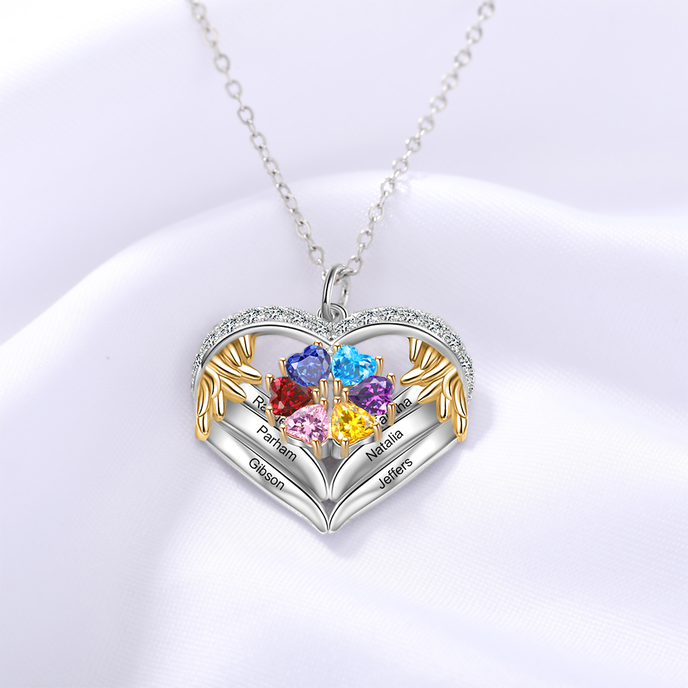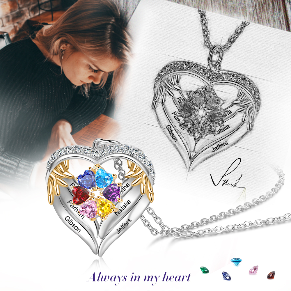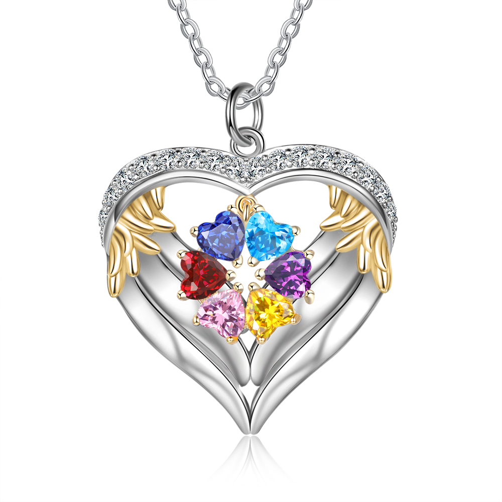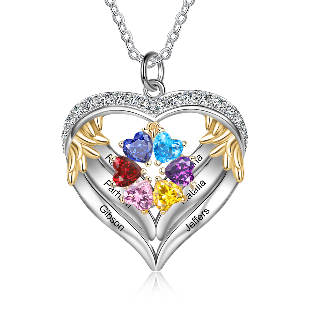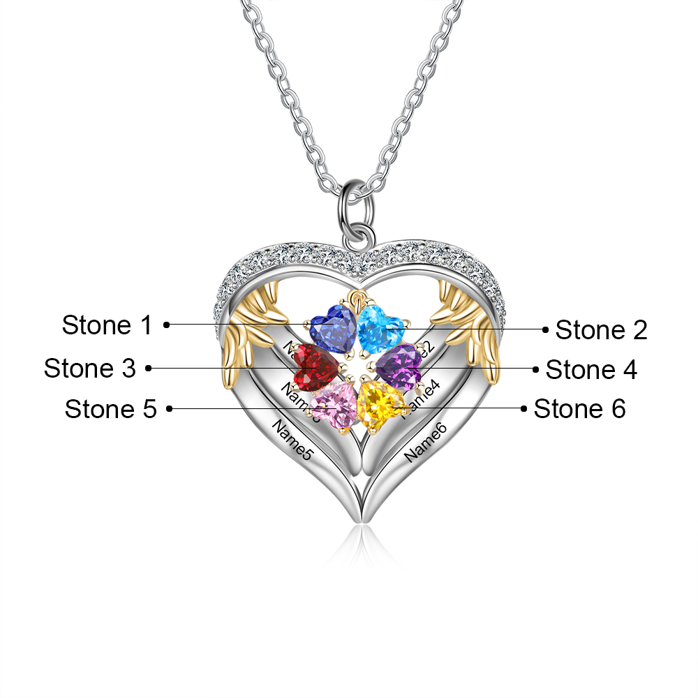 S925 Silber Gravur 6 Namen Herz Engel Flügel Halskette mit 6 Geburtssteinen