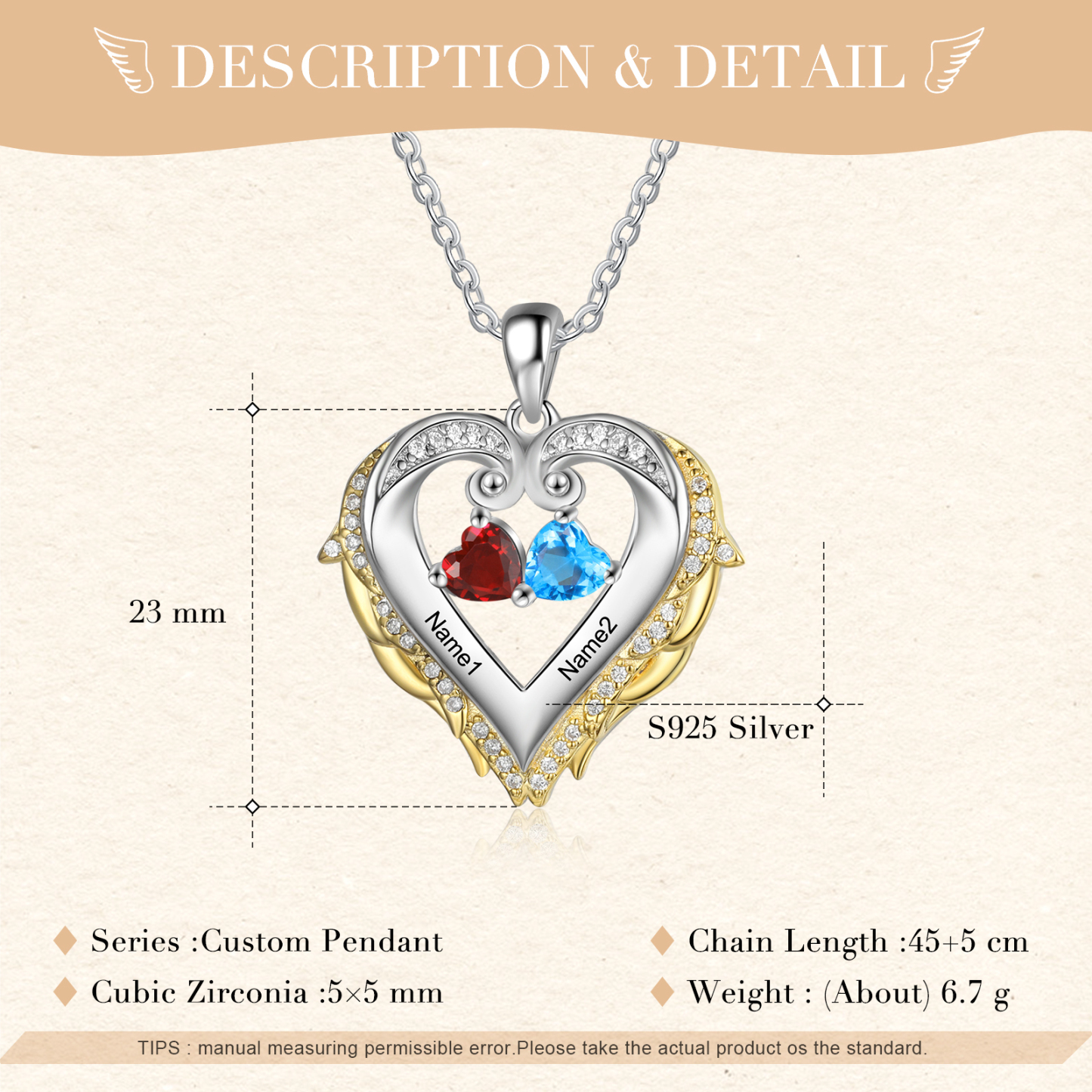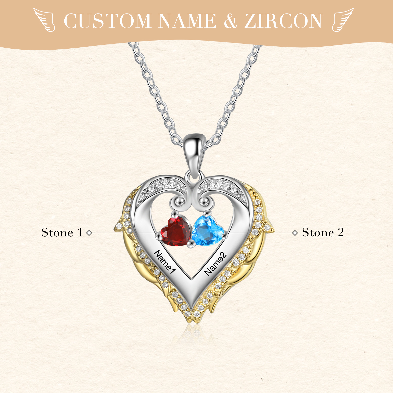 S925 Silber Personalisierte 2 Namen Engelsflügel Halskette mit 2 Geburtssteinen